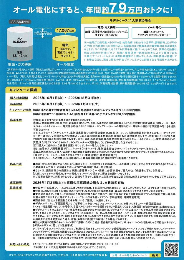 もしくは、販売店等から受領した専用の応募兼アンケート用紙に必要事項をご記入の上、「保証書の写し」を同封し、「九州にもっとオール電化を。オール電化キャンペーン」係までご郵送をお願いいたします。