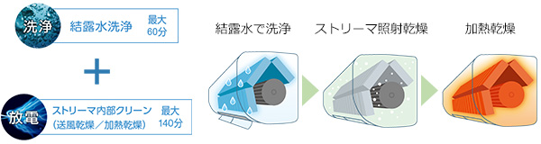 冷房・除湿運転の停止後、自動的にストリーマ照射と送風・暖房で乾燥を行います。