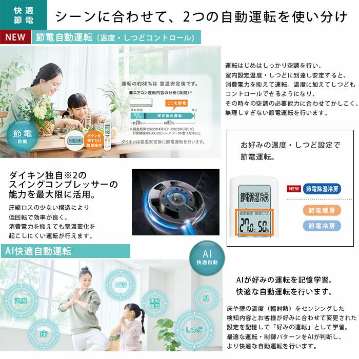 目標年度2027年省エネ基準を達成 9.0kwクラスを除く NEWプレミアムPIT制御 小さな能力が出せるので、室温がさらに安定します。 NEWエコブースト制御 学習効果で、高効率でムダなく立ち上げます。 節電自動運転(温度・しつどコントロール) 室内が設定温度・しつどに到達し安定すると、消費電力を抑えて運転します。
