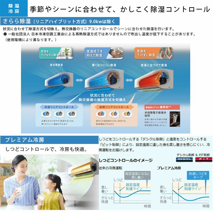 プレミアム冷房 設定温度になったあとも蒸し暑さを感じにくい快適冷房をお届けします。 さらら除湿 季節やシーンに合わせて、かしこく除湿コントロールします。 NEW猛暑時スピード気流 猛暑の時は、お部屋の中央へより涼しく冷房気流を集中させます。